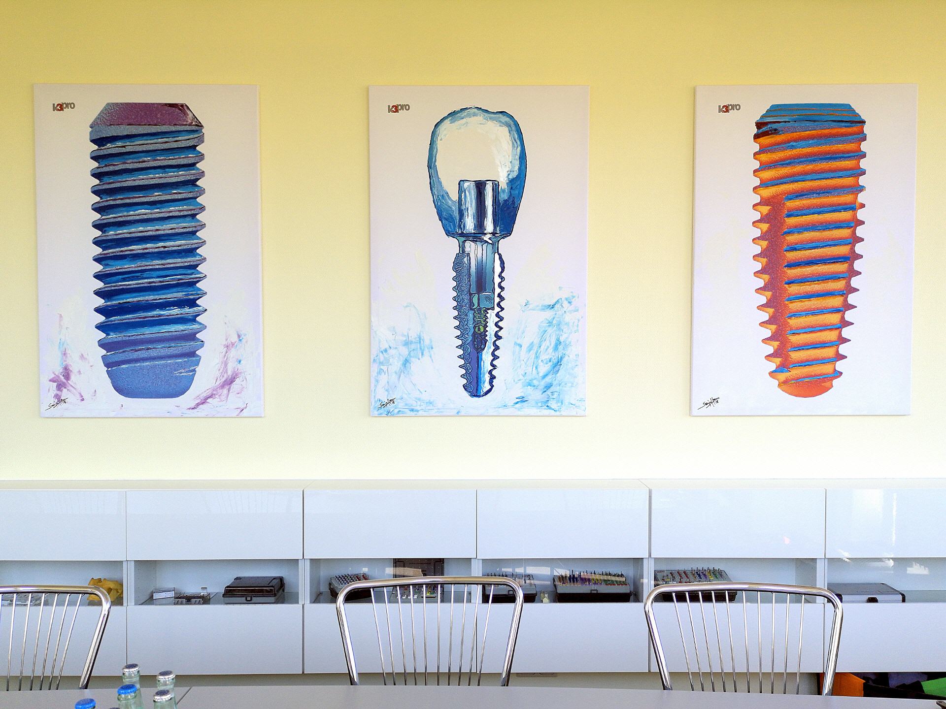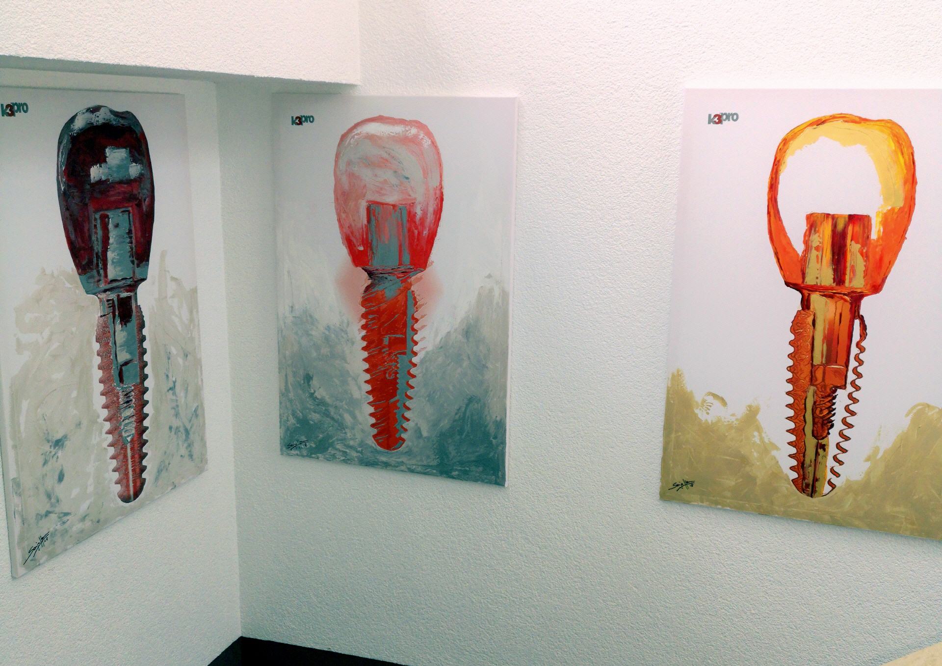 Die konzeptionelle Entwicklung dieser individuellen Exponate entstand in Zusammenarbeit mit dem internationalen Implantat Hersteller ARGON aus Bingen am Rhein. Die Künstlerin Sonja Henn setzte sich im speziellen mit dem Thema K3PRO Implantat auseinander. Die entstandenen Kunstwerke – jedes ein UNIKAT – wurden anhand des Originalbildmaterials des K3PRO Implantats fotodesignd und farblich verändert. Die eigentlichen 3-6mm großen Titanimplantate zeigen sich in neuen Farben und übergroßen Dimensionen. Dennoch bleibt der ursprüngliche Karakter unangetastet. Die Fotokunst wird auf Leinwand gebracht und partiell mit Acryl- und Ölfarbenfarben individuell mit Spachteltechnik von der Künstlerin bearbeitet.